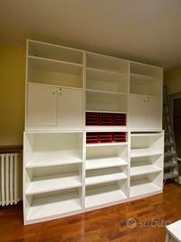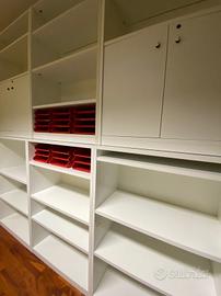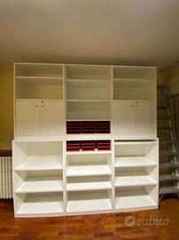 Si vendono solo in blocco, N. 6 moduli di scaffali con due armadi con serratura e chiavi presenti, di colore bianco, in ottimo stato d'uso e conservazione, normali e piccoli segni che non ne compromettono il normale utilizzo né funzionale né estetico.