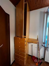 2 armadi fatti da falegname rivestiti in frassino (nr.1 con 3 ante e nr.1 a colonna con cassetti) + 1 armadio 3 ante in laminato bianco