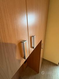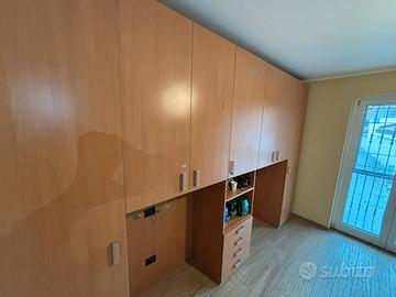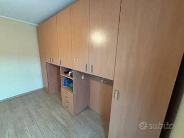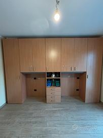 Vendesi imponente armadio a ponte in finitura legno chiaro, ideale per camerette, uffici o stanze multiuso. Progettato per massimizzare lo spazio sfruttando l'intera parete, offre una soluzione completa che unisce guardaroba, scaffalature e vani per letti o scrivanie. Caratteristiche Principali: • Capacità Extra: Dotato di ben 8 ante superiori e 2 ampie colonne laterali a tutta altezza. • Design Intelligente: La struttura a ponte permette di inserire comodamente due letti singoli o due postazioni scrivania nei vani sottostanti. • Modulo Centrale: Include una pratica colonna centrale con 4 cassetti e vani a giorno per libri, giochi o piccoli oggetti. • Finitura Versatile: Il color legno naturale si adatta facilmente a qualsiasi stile d'arredo, dal moderno al classico. Dimensioni: • Larghezza totale: 3.80m • Altezza: 2.60m • Profondità: 60cm Stato dell'oggetto: L'armadio è in ottime condizioni generali, solido e funzionale. Le maniglie sono tutte presenti e i meccanismi di apertura perfettamente funzionanti. Spedizione a carico dell’acquirente o ritiro sul posto