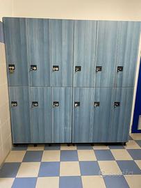 Vendo armadietti blu a blocchi da 6 antine ciascuno, misura: 105x216x51 (l x a x p) per un totale di 8 blocchi.