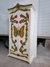armadietto in legno a ripiani intagliato e laccato bianco anticato e decorato a mano