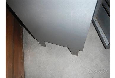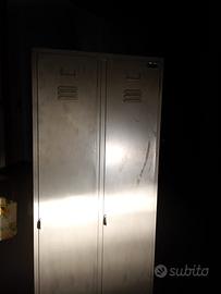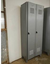 Armadietto a due ante utilizzato negli spogliatoi di fabbriche o officine in metallo verniciato grigio. Con portaombrelli all'interno