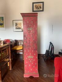 Armadietto indiano etnico rosso depinto a mano, importato direttamente dall’India 30 anni fa. Altezza 152cm, larghezza 57cm, profondita 37cm. Buona condizione…un piccolo gioello oer l’ambiente giusta…
