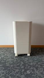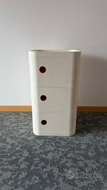 Contenitore modulare quadrato in plastica rigida colore panna con finitura liscia, composto da 3 vani separati e impilabili. Ogni vano ha anta frontale con chiusura magnetica e foro circolare per l’apertura. Struttura compatta e solida; le ante si aprono/chiudono correttamente e la chiusura magnetica le mantiene ben aderenti. Interni puliti e vuoti.