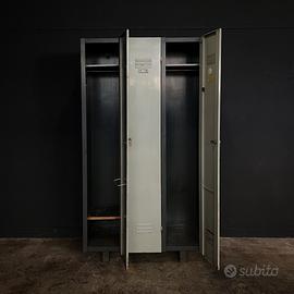 Armadietto spogliatoio anni ‘80 a tre ante con piedi di rialzo, proveniente da storica officina Piaggio di Milano. Porta i segni del tempo ma si presenta molto robusto. Senza impegno alcuno è possibile visionarlo nel nostro magazzino 3382547476