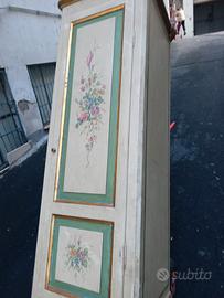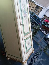Armadietto di fine 700 colonna multiuso ad 1 porta con 4 ripiani e bastone. Utile sia per abbigliamento ripiegato o documenti che anche come porta scope aspirapolvere ecc. decorato a mano in stile veneziano da antico restauratore di Via Margutta . Ben si inserisce in tutti gli arredi con eleganza e allegria.