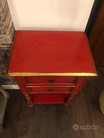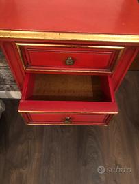 Comodino in legno con due cassetti e un ripiano inferiore , laccato in rosso con finitire dorate misure -76-35-48