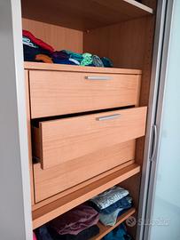 Armadio 2 ante scorrevoli satinate con profilo esterno in ferro. Cassettiera interna e ripiani inseriti.
