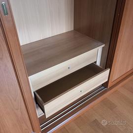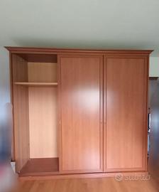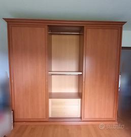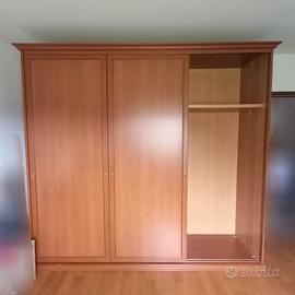 Armadio n. 3 ante scorrevoli. Misure H 253 cm L 270 cm P 66 cm. N. 2 barre appendiabiti. N. 1 cassettiera centrale con 3 cassetti. Vendo per cambio arredamento. Già smontato. Ritiro a carico dell’acquirente.