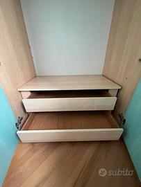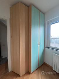 Vendo armadio a 3 ante con struttura color legno naturale e ante color turchese, dal design moderno e luminoso. Perfetto per cameretta, studio o casa vacanze.