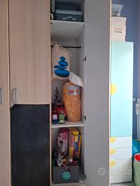 Vendo armadio 3 ante, misure: profondità 60 cm,larghezza 130 cm, altezza 240 cm. Tre ante, 3 cassetti. Davanti ci sono 2 adesivi che hanno fatto da lavagnetta per il bimbo, si possono togliere.
