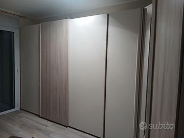 Armadio di colore Beges con tre ante scorrevoli due con cassettiera una con doppia barra appendi abiti (alto, basso) , con annesso un anta a ripiani , altra anta ad angolo con specchio e altre due ante con ripiani , angolo reversibile , allego piantina nelle foto. Anno acquisto 2020 Asta del Mobile, prezzo trattabile