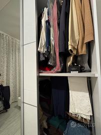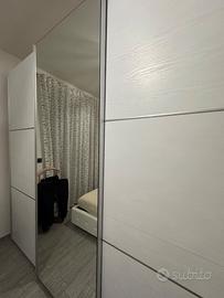 Le tre ante sono scorrevoli e quella in mezzo ha lo specchio. L’armadio è rivestito con carta effetto legno bianco, volendo si può togliere e il colore originale dell’armadio è marrone.