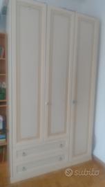 vendo armadio 3 ante e 2 cassetti, presenta un' ammaccatura e segni di usura. nel complesso è un armadio massiccio con ante pesanti e resistenti.