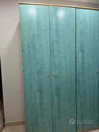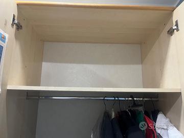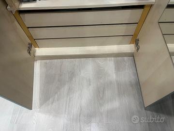 Con 3 cassetti inferiori e 2 mensole alte con appendiabiti e specchio integrato.