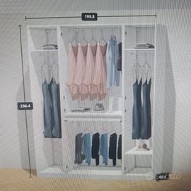 Armadio 4 ante bianco 237x200x61 con ante centrali specchiate e contenenti due ampi settori per giacche, maglie e camicie e un cassetto porta gioielli con divisori interni. Le 2 ante laterali sono state pensate per abiti lunghi e cappotti ma le divisioni interne possono essere personalizzate.