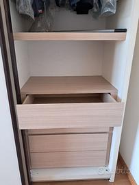 Colore chiaro con profili in legno scuro. Interni con scaffali e cassettiere in legno chiaro. Misure larghezza 300cm profondità 60cm altezza 255cm. Smontaggio a carico dell'acquirente.