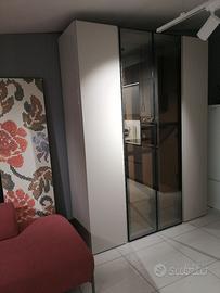 Armadio nuovo bellissimo, utilizzato solo per esposizione della Santa Lucia Mobili cm. 193 x h. 253 x p. 61 laccato ghiaia opaco, con 4 ante , le due centrali con telaio in alluminio titanio e vetri Stop Sol, interno 2 cassetti , porta maglioni, porta scarpe inclinato, appendiabito servetto reclinabile. Escluso trasporto e montaggio.