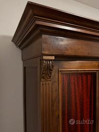 Si tratta di un armadio con provenienza della Banca D’Italia, presenta delle fiammature naturali sui pannelli inferiori e intagli artigianali sui capitelli superiori.