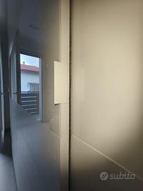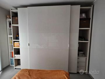 Vendo armadio 4 ante bianco di mobilificio Finitura legno bianco e vetro bianco satinato Dim. 320x257 Ante scorrevoli rallentate e cassettiera 4 cassetti, 6 ripiani e bastoni appendi abiti in alluminio. Marca BALLANCIN