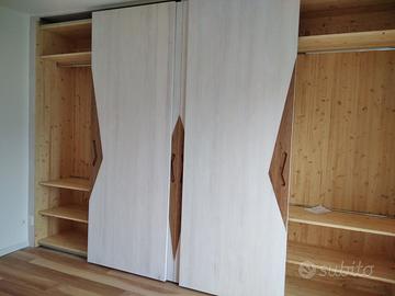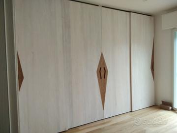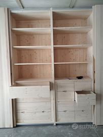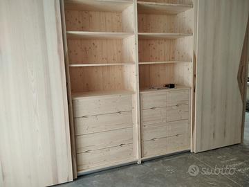 armadio interno costruito in abete massello spazzolato con misure lunghezza 400 profondità 62/65 altezza 280 (con fasce laterali a L per tamponamenti laterali) disposto a 4 ante scorrevoli ammortizzate in chiusura su 4 moduli da circa 98 cm cadauno. I fianchi avranno venature verticali con spessore 20 mm e internamente i ripiani saranno da 24 mm in monostrato di abete, lo schienale sarà autoportante in massello di abete da 14 mm con fascia all'estremità per dare robustezza al tutto. La disposizione interna sarà suddivisa nel primo e quarto vano con 2 ripiani sotto aggiustabili in altezza e 1 parte superiore con sotto il bastone porta abiti in alluminio, nei 2 moduli centrali 1 cassettiera per vano cassettiere in cui in una con 4 cassetti ampi che scorreranno su guide ammortizzate in chiusura mentre nel altro vano una cassettiera con 8 cassetti + piccoli, interno cassetto in betulla da 16 e fondo da 6 mm apertura con fresata a trinagolo, sopra troveremo 3+3 ripiani a dx sx (totale 6) sempre aggiustabile in altezza con ferramenta adatta. le 4 ante sono costruite a 3 strati interno multistrato ed esterno cartelle in massello di frassino in modo che non si incurvino nel tempo e dare la bilanciatura omogenea con relativi raddrizzanti interni, spazzoline parapolvere e applicato all'estremità del punto di apertura inserto in rovere vecchio recuperato con maniglia ricavata a gola per apertura e chiusura anta, lo scorrevole su guida superiore binario in alluminio ammortizzati e binario inferiore per agevolare il movimento con gancio e sgancio rapito. Piedini livellatori per mettere a bolla il tutto e unione dell'armadio con barilotti perni in ferro e spine il legno. il tutto spazzolato e la finitura interna su abete oliata mentre sulle ante su frassino cerato bianco e nell'inserto del rovere oliato per risaltare il colore. il mobile è già stato venduto e non teniamo magazzino ma nessun problema per riprodurlo. ASTENERSI RIVENDITORI COMMERCIANTI