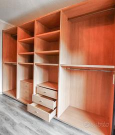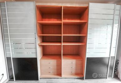 spaziosissimo armadio a 4 ante scorrevoli, con struttura in legno e ante in vetro satinato e legno scuro, dallo stile moderno ed elegante. Internamente è molto ben organizzato: vani appendiabiti larghi, colonne centrali con ripiani e 6 cassetti totali (3 per colonna), ideale per chi ha bisogno di tanto spazio.