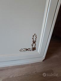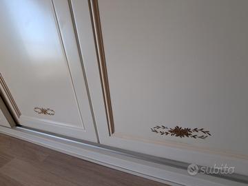 Armadio laccato panna e decori fatti a mano, 4 ante scorrevoli, due laterali e vano centrale con anta doppia.