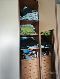 Armadio per camera da letto, in ciliegio con ante rivestite in melamina color rosa salmone. Misure dell'armadio: 258 altezza x 62 larghezza x 233 lunghezza. Misure interne dei ripiani: 6 ripiani larghi 90x50, 3 ripiani stretti 44x50. Cassettiera alta 120cm con 8 cassetti (37x50). In ottimo stato non è mai stato smontato. Il prezzo NON INCLUDE lo smontaggio. Il trasporto è a carico del compratore.