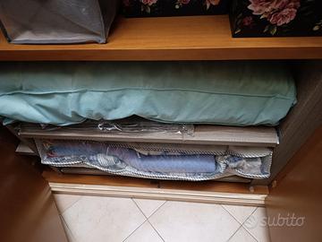 Le ante laterali coprono due spazi larghi 108Cm, dietro quelle di sinistra sono presenti 2 ripiani originali con un asta fissa alla struttura nella parte superiore mentre sotto vi sono 2 ripiani aggiuntivi scorrevoli; le ultime a destra sono dotate di 2 specchi per potersi guardare di spalle, qui sono presenti 2 piani e 2 aste appendi abiti. L'anta centrale è più larga e misura 64Cm e copre 4 ripiani larghi 63,5Cm con un'asta fissata alla parte superiore della struttura.