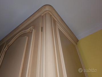 Cornice superiore ed inferiore in legno, ante lavorate e dipinte.