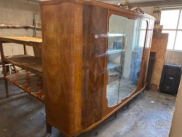 Armadio a cinque ante in stile Mid-Century Modern italiano, risalente agli anni '50 * Impiallacciatura in radica di noce: Le ante centrali presentano una magnifica lavorazione a "macchia aperta" (o specchiata). * Specchiatura Sagomata: Le due ante centrali sono dotate di grandi specchi con un taglio sagomato e arrotondato agli angoli, che segue la linea fluida (stile "organico") del mobile. * Cimasa Decorativa: Sulla sommità dell'armadio è presente un elemento decorativo in legno intagliato (la cimasa) dalle linee curve e sinuose, che richiama lo stile barocchetto rivisitato in chiave moderna. * Intarsi Laterali: Motivo a "filo" intarsiato in legno chiaro. Struttura e Piedini * Fianchi Arrotondati: I lati del mobile non sono spigolosi ma curvi, una caratteristica che richiedeva grande abilità tecnica e che rende il mobile meno massiccio alla vista. * Piedini a Spillo: L'intera struttura poggia sulle caratteristiche gambe sottili con puntali in ottone, mantenendo quella sensazione di "sospensione" tipica del design anni '50. Eventuale smontaggio e trasporto a carico dell'acquirente Misure: Larghezza 270cm, altezza 190cm, profondità 60cm