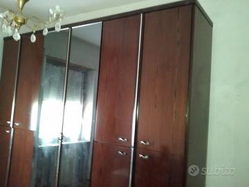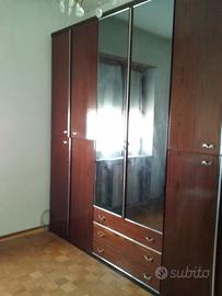 Armadio anni 70, costruito per durare, con 4 ampi vani (laghi 82cm), alcuni con bastone appendi abiti, altri con ripiano mezzano, un ampio vano (lago 82cm) centrale con ante a specchio e 3 cassetti da 82x50cm.