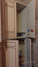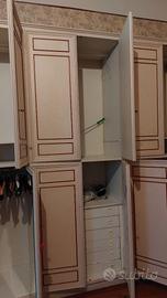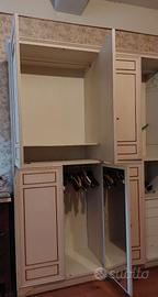In basso: 2 parti laterali con spazio per appendere + 1 spazio centrale con cassetti e ripiano
