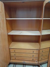 Per rinnovamento, vendo armadio in stile, anni 70 in legno in radica di noce, 6 ante in perfette condizioni, non usurato, con chiave e serratura originali. È composto da 2 vani laterali con appendiabiti, mentre il vano centrale è dotato di 2 scomparti e 3 cassetti in legno. Misure: 300×175×60cm