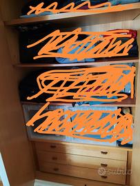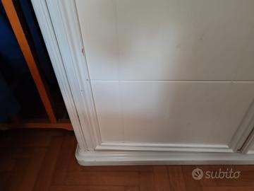 Armadio in legno tamburato alto 257 cm. e largo 310 cm, marca ParmaLine. E' in buone condizioni e presenta due piccoli incavi in uno dei due sportelli contrali, dovuti allo schiacciamento di un cursore in plastica tra lo sportello e il bordo dei uno dei ripiani. Il ritiro deve avvenire improrogabilmente entro aprile con smontaggio e trasporto a carico dell'acquirente.