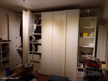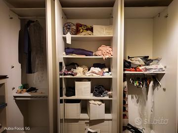 Bellissimo armadio bianco 6 ante con specchio, rastrelliera per pantaloni, 3 cassetti, 3 sezioni per appendere lunghi abiti, 6 ripiani, maniglie che spariscino alla vista grazie al colore in tinta.