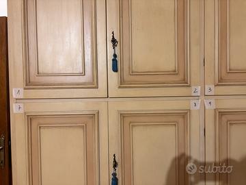 Armadio con ante a battente in stile provenzale, con finitura anticata beige. E’ caratterizzato da ante battenti, cornici decorative e maniglie con nappe ornamentali blu. Al centro è presente una cassettiera. Misure L. 307 P. 59/60 H. 271, l’armadio è già smontato e si trova a Serravalle Pistoiese. Necessita mezzo adeguato per il trasporto.