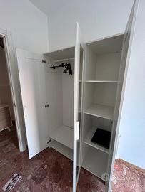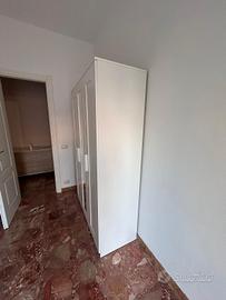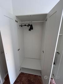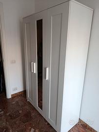 Design a pannelli bianco con un'anta centrale a specchio, include internamente un bastone appendiabiti e dei ripiani regolabili. Larghezza 117 cm, Profondità 50 cm, Altezza 190 cm.