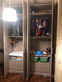 Vendo armadio a 4 ante, colore rovere chiaro, 2 vani appendiabiti, 6 cassetti, 6 ripiani. Condizioni: ottime. Dimensioni: 195 L x 60 P x 295 H.