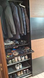 Vendo armadio a 4 ante scorrevoli Scarpiera a 3 livelli a tutta lunghezza Ripiani estraibili portacinture 2 vani per giacche 2 vani a 3 ripiani Colore nero e noce Ritiro a carico dell'acquirente Prezzo trattabile
