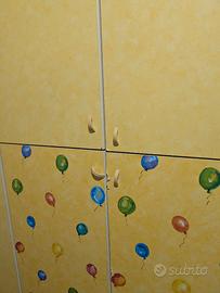 La tappezzeria (carta da parati con motivo a palloncini colorati) è parzialmente staccata in alcune ante, vedi foto in dettaglio.
