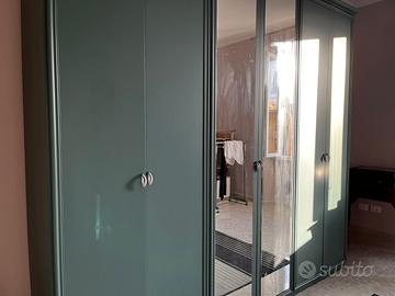 Armadio a 6 ante usato in buone condizioni, color tiffany all'esterno, bianco all'interno, ante centrali specchiate. Alto 2,4m, lungo 2,8m, profondo 60cm. Da ritirare di persona, la consegna non è inclusa nel prezzo.