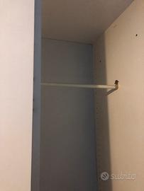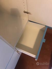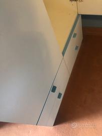 Armadio a due ante con cassettiera (4 cassetti), bianco con profilino azzurro. Misure: - larghezza 90 cm - profondità 59 cm - altezza 230 cm