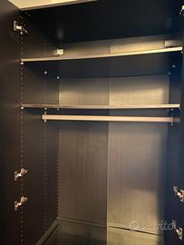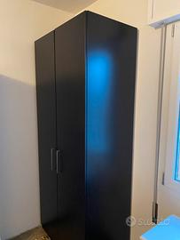 Armadio IKEA a due ante, marrone scuro/nero, con cassettiera interna e lastra di vetro copri cassetto. Spazioso e capiente, ha tre pratici cassetti di diverse profonditá. Presenta leggere tracce di adesivo nella parte interna delle ante, per il resto é in ottime condizioni.