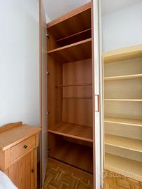 Armadio di colore beige fuori e legno rosso dentro. Ha tre ripiani e due aste per appendere gli abiti. Presenta alcuni segni di usura. Misure 94x60x244 cm