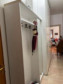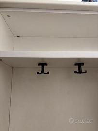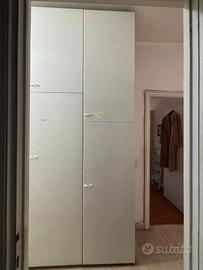 Vendo armadio componibile a parete, colore chiaro, in buone condizioni generali. La composizione è formata da 3 moduli singoli larghi 60 cm, profondi 45 cm e alti 300 cm. Ad eccezione del modulo di destra, che ha degli scaffali, gli altri hanno barra appendiabiti. Della composizione fa parte anche un modulo con appendiabiti e specchio, largo 135 cm, profondo 30 cm e alto 190 cm. L’armadio è capiente e funzionale, ideale per camera da letto, cabina armadio o ripostiglio. Il ritiro solo a mano a carico dell'acquirente a Lido di Ostia, con smontaggio da concordare.
