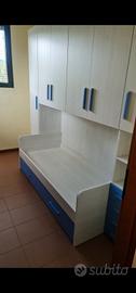 Vendo armadio a ponte 6 ante battenti e 4 cassetti con 2 letti, color bianco neve e blue denim, dimensioni 294x95x245.