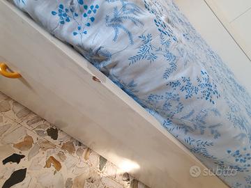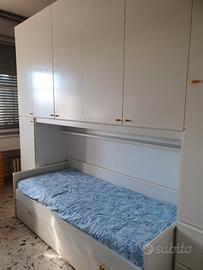 Robusto armadio a ponte bianco, con maniglie gialle. Lungo 3 metri e alto 2,60; 7 ante, 4 cassetti, cassettone con seconda rete. Ottime condizioni; piccoli difetti solo nella barra del letto e nel cassettone.