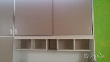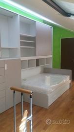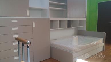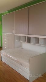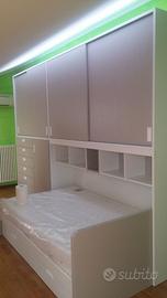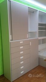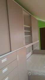 armadio a ponte con cassettiera e letto in laminato (di buona qualità interno riciclato legno pioppo e abete) con scocca parte esterna finitura bianco venato con ante e parte frontale con finitura (grigio chiaro) canapa venato. Le misure dell’armadio sono con lungh.350 circa prof. 50 h 250 composto nella parte sotto partendo da sx con una cassettiera lungh. circa 80 composta da 7 cassetti che scorreranno su guide ammortizzate e a fianco troveremo un’anta con 2 ripiani interni aggiustabili. Troveremo poi la disposizione per un letto ad una piazza e mezza da 120 x 200 completo di rete a doghe e materasso acqua waterlily (dr valsecchi) sfoderabile e lavabile di buona qualità, sotto 2 cestoni estraibili con ruote per poter usufruire anche della parte sotto al letto. Troveremo 5 vani a giorno sopra al letto in modo da poter riporre oggetti o altro con circa 27 x 36. Nella parte alta per motivi di praticità e soprattutto per non avere problemi con l’apertura verso il tetto spiovente delle 4 ante saranno scorrevoli 2 nella parte sopra al letto e 2 nell’altro vano. Complete internamente con 2/3 ripiani aggiustabili per vano e tubo porta abiti con rinforzo in tubolare in ferro in modo da avere una garanzia di stabilità dei pensili. Avremo gambette livellatrici per poter mettere a bolla il tutto e avremo maniglie incassate bianche. Nella parte superiore esterna all’armadio metteremo led per poter dare luce alla stanza riflessa sulla parte con apposito trasformatore a luce fredda. Iva non comprendente, costruito su commissione, non disponibile a magazzino ma possiamo riprodurlo DIRETTAMENTE DAL PRODUTTORE ASTENERSI RIVENDITORI O COMMERCIANTI