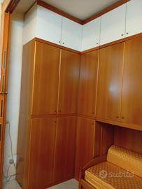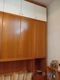 Ampissimo armadio a ponte con divano letto (2 letti singoli) in legno, in ottime condizioni, unici difetti 1 pomello rotto e base laterale danneggiata (vedi foto). La fascia superiore bianca dei mobili è stata aggiunta successivamente. Cedibile anche solo l'armadio senza blocco bianco ed è alto 260 cm.